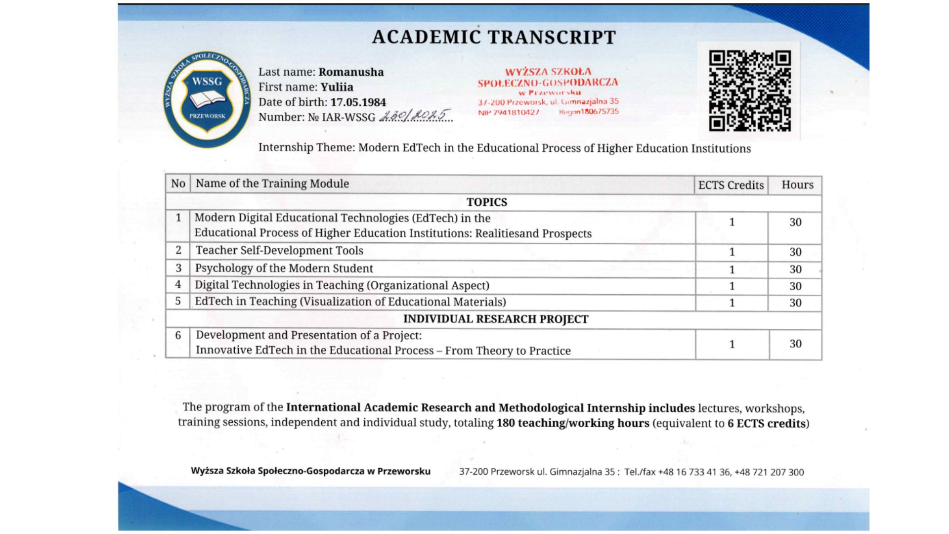 У межах забезпечення якості освітньо-професійної програми та з метою оновлення професійних і методичних компетентностей гарант освітньо-професійної програми ОПП «Менеджмент адміністративної діяльності, сфери послуг та торгівлі» пройшла міжнародне підвищення кваліфікації.