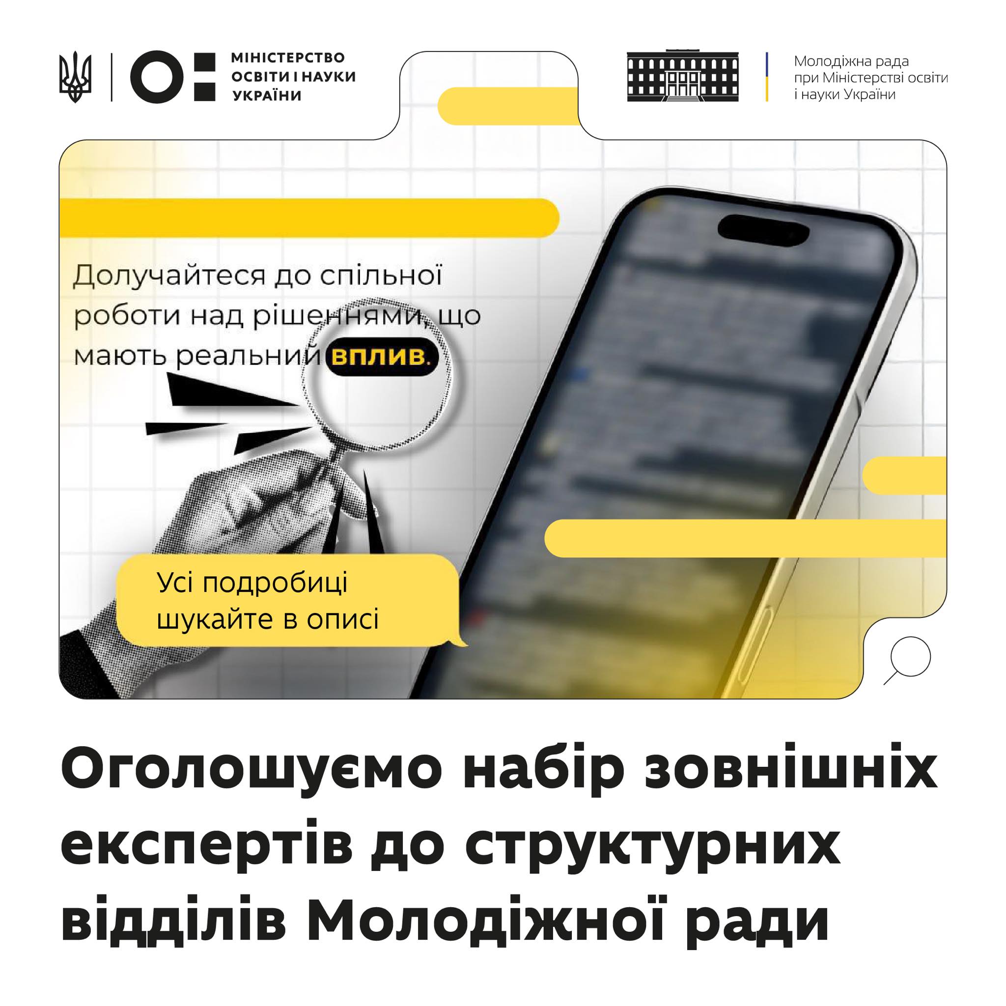 Міністерстві освіти і науки України запрошує молодь віком від 14 до 35 років (включно), яка має експертизу, практичний досвід і бажання долучитися до формування рішень державної політики у сферах освіти і науки, наукової, науково-технічної діяльності, інноваційної діяльності.