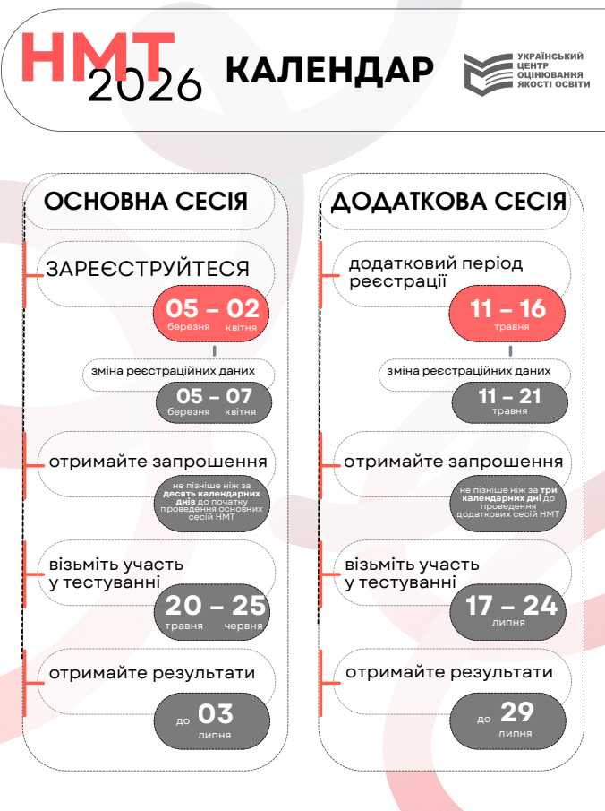 Наказом Міністерства освіти і науки України затверджено Календарний план організації та проведення у 2026 році національного мультипредметного тесту (НМТ). Радимо майбутнім учасникам і учасницям заздалегідь занести важливі етапи до особистого календаря.