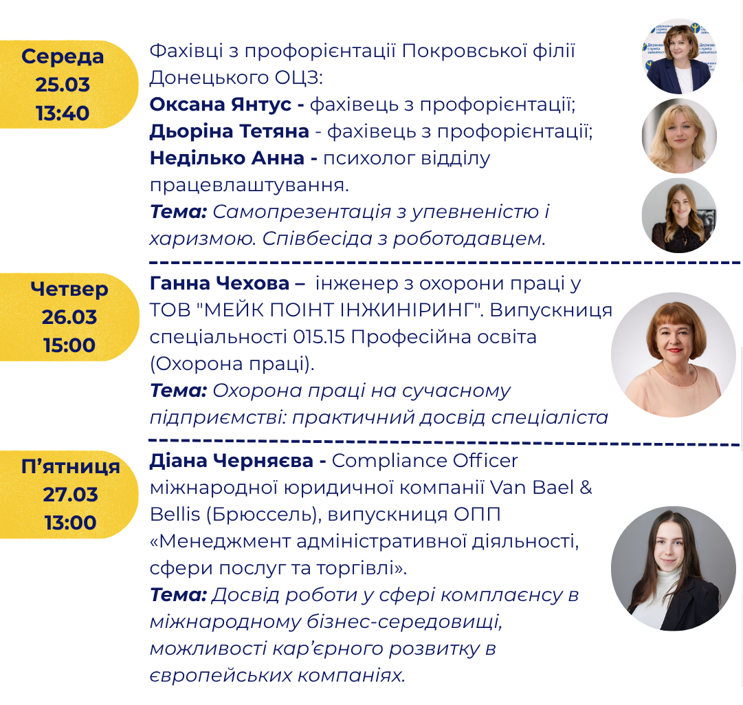 До участі запрошуються студенти, абітурієнти та всі, хто прагне дізнатися більше про сучасні професії, особливості працевлаштування та можливості кар’єрного розвитку. У межах заходів заплановані зустрічі з випускниками інституту, практикуючими фахівцями, представниками освітньої сфери, бізнесу та державних установ.