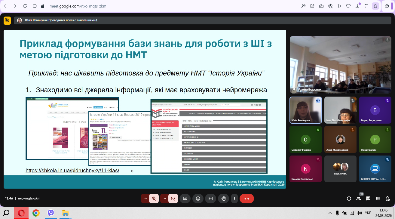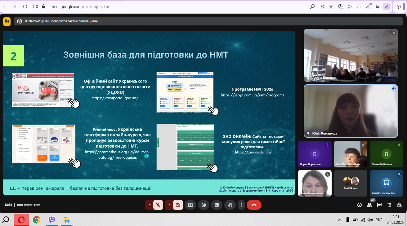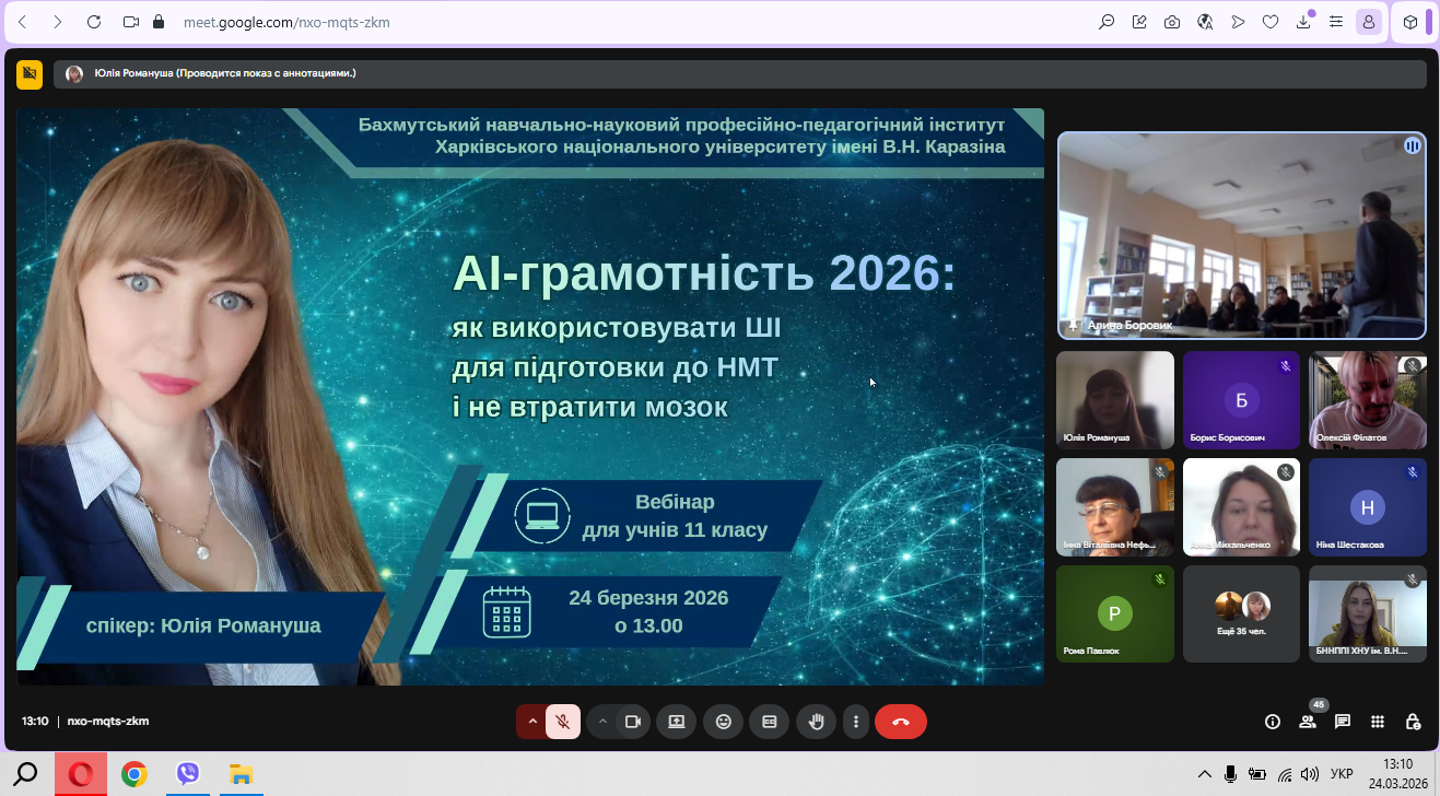 24 березня 2026 року доцент кафедри економіки підприємств та менеджменту Бахмутського навчально-наукового професійно-педагогічного інституту Харківського національного університету імені В. Н. Каразіна Юлія Романуша провела вебінар для учнів 11 класів у межах роботи Школи вихідного дня.